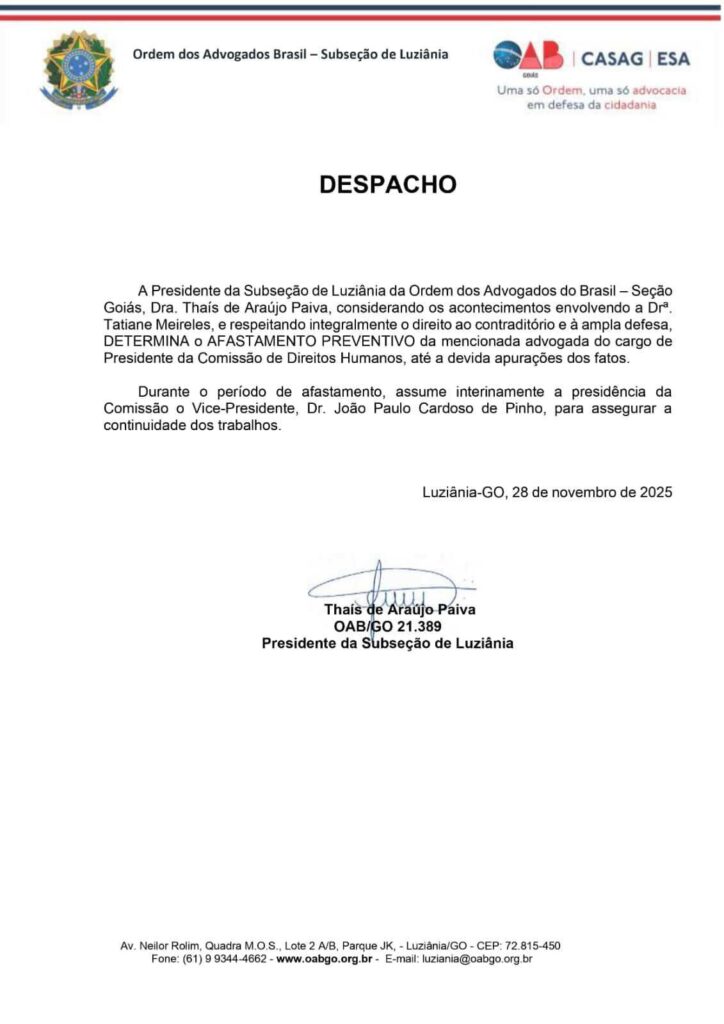 A Subseção da Ordem dos Advogados do Brasil (OAB) de Luziânia afastou, no dia 28 de novembro, a advogada Tatiane Meireles do cargo de presidente da Comissão de Direitos Humanos da entidade. A medida foi adotada após a profissional aparecer em vídeos agredindo um homem e se tornar alvo de investigação por suposta participação em uma quadrilha de agiotagem.
