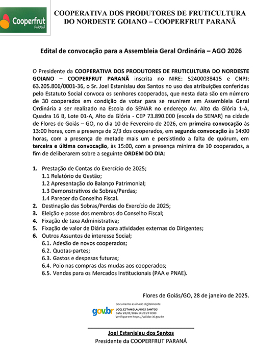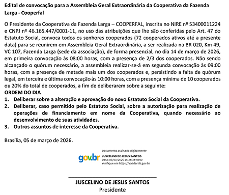 PARA A ASSEMBLEIA GERAL EXTRAORDINÁRIA COOPERATIVA DE APICULTORES DO DF E RIDE – COOAPIS DF e RIDE O Presidente da COOPERATIVA DE APICULTORES DO DF