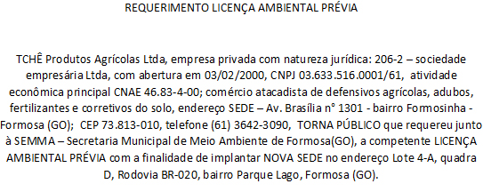 A Olfar S/A – Alimento e Energia, CNPJ: 91.830.836/0077-77, torna público que recebeu da Secretaria de Meio Ambiente de Formosa (GO), a Licença Ambiental de